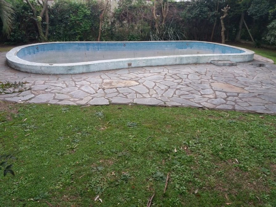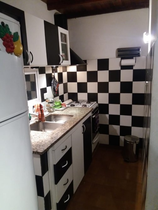 - Cocina completa de 4x1 aprox. con muebles bajo mesada, alacenas, mesada de mármol con doble bacha y grifería, artefacto y campana.